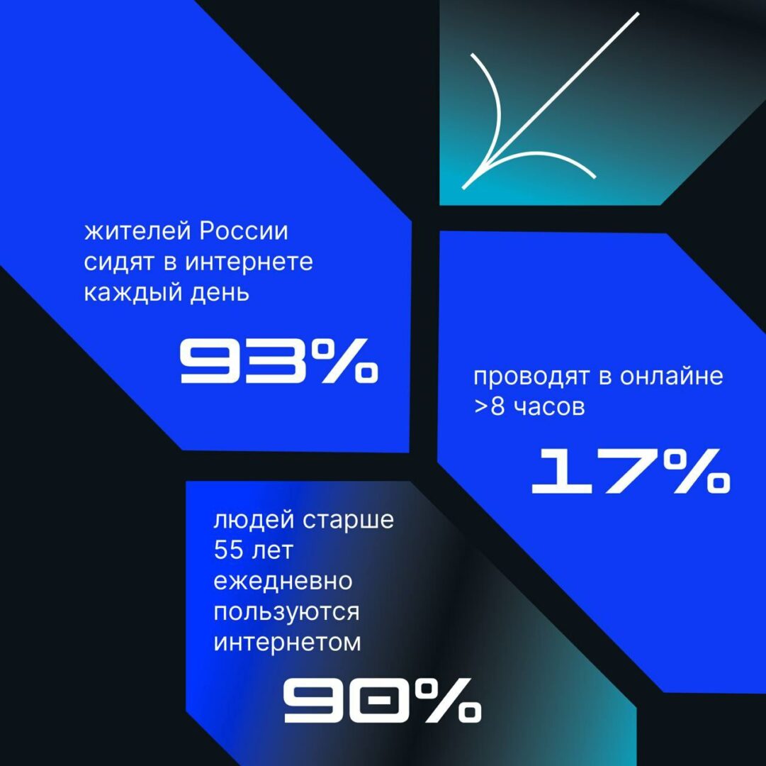93% россиян выходят в интернет каждый день, 17% проводят в онлайне более 8 часов. Почти половина тратит на интернет до 4 часов каждый день.