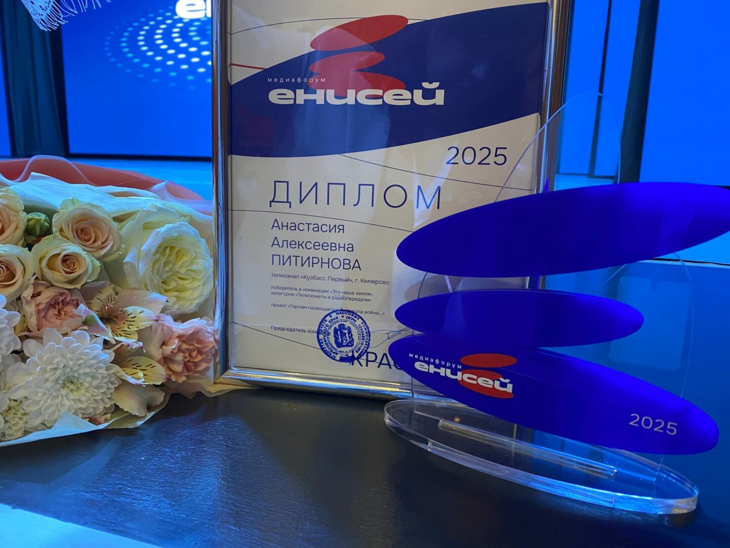 В Красноярске на медиафоруме «Енисей» подвели итоги творческого конкурса журналистского мастерства. И победителем в номинации «Это наша земля» стал проект Анастасии Питирновой, главного редактора телеканала «Кузбасс Первый», который называется «Героям посвящается: и пришла война».